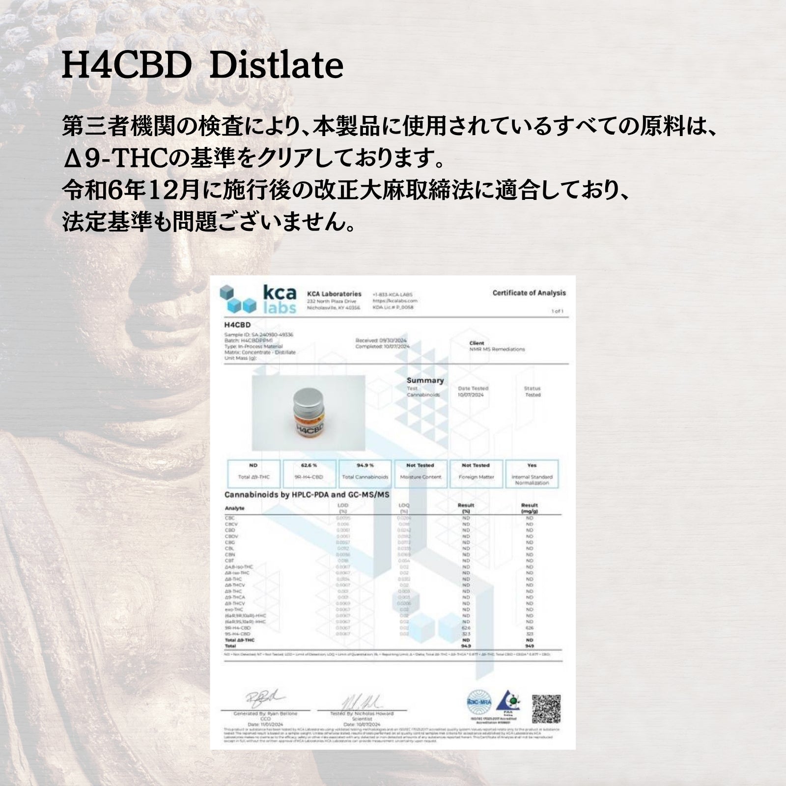 本製品は、国内外の関連法規およびガイドラインに基づき、必要な手続きを経て正規に輸入されたH4CBDディスティレートです。